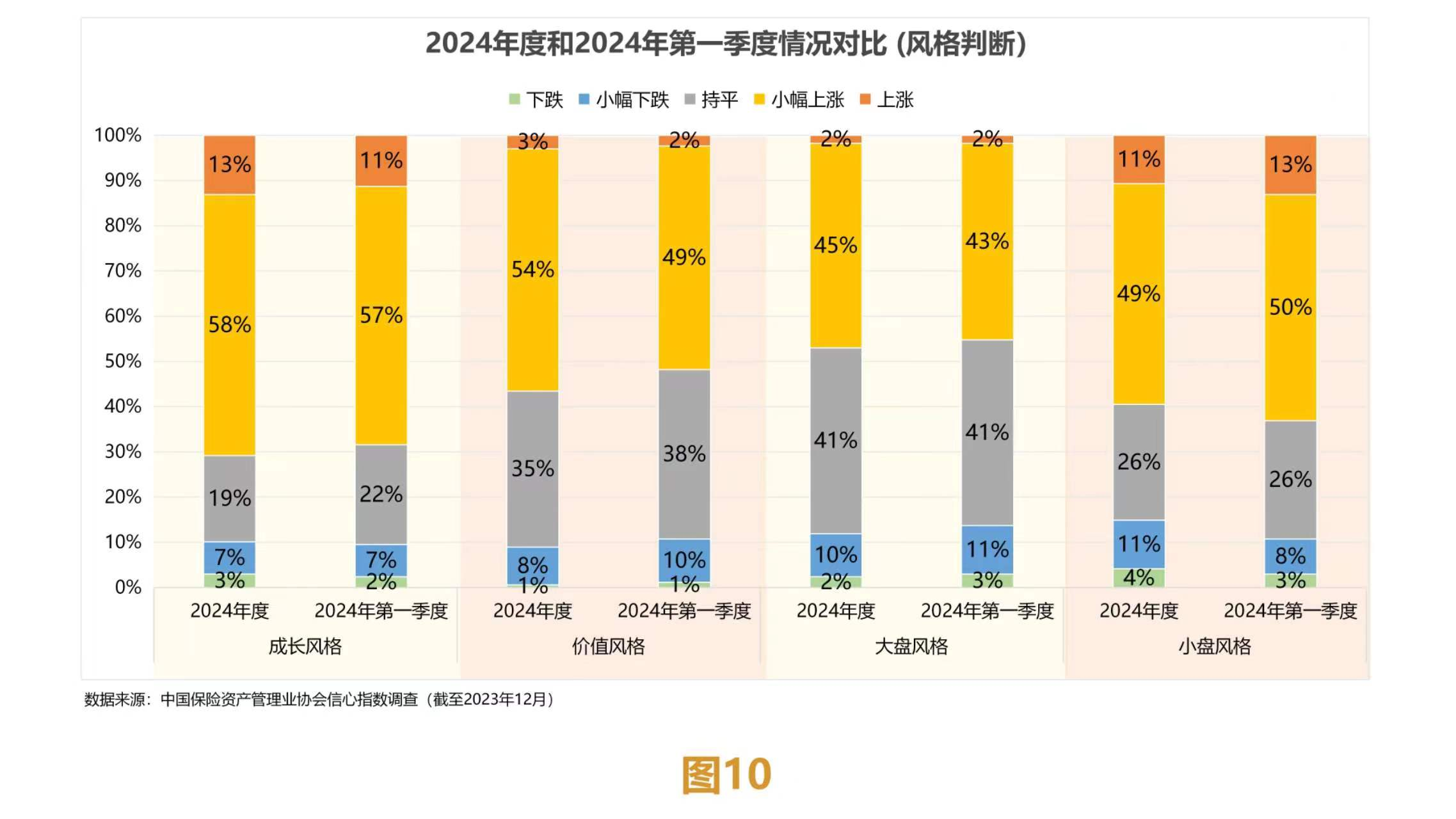 在格调判断方面,保障机构对2024年度和2024年第一季度成长格调、价值格调、大盘格长入小盘格调的预期基本一致,大大批保障机构预判均将小幅飞腾,较为看好成长格长入小盘格调。其中,保障公司较保障资管公司更看涨成长格调、大盘格长入小盘格调,但保障资管公司对大盘格调看涨经由不高。