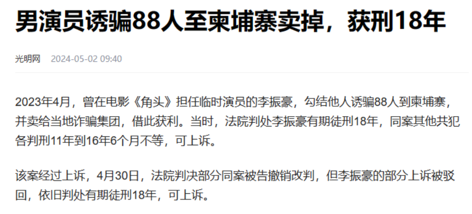 2024-05-02光明网:男演员拐骗88东谈主至柬埔寨卖掉,获刑18年